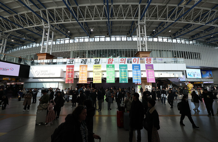 Banners bearing protest messages from unionized rail workers are hung inside Seoul Station in the capital on Dec. 10, 2025, as the union has threatened to launch a general strike on Dec. 11. (Yonhap)