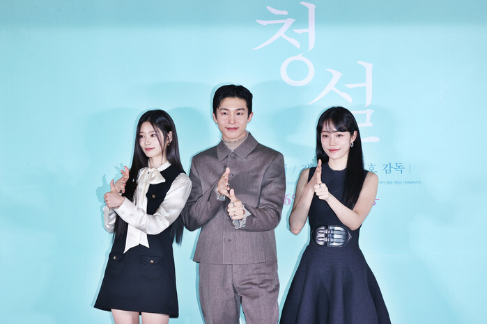 The stars of the new movie "Hear Me: Our Summer" -- Kim Min-joo, Hong Kyung and Roh Yoon-seo (L to R) -- pose for a photo during an event in Seoul on Oct. 28, 2024. The movie will be released in South Korea on Nov. 6. (Yonhap)