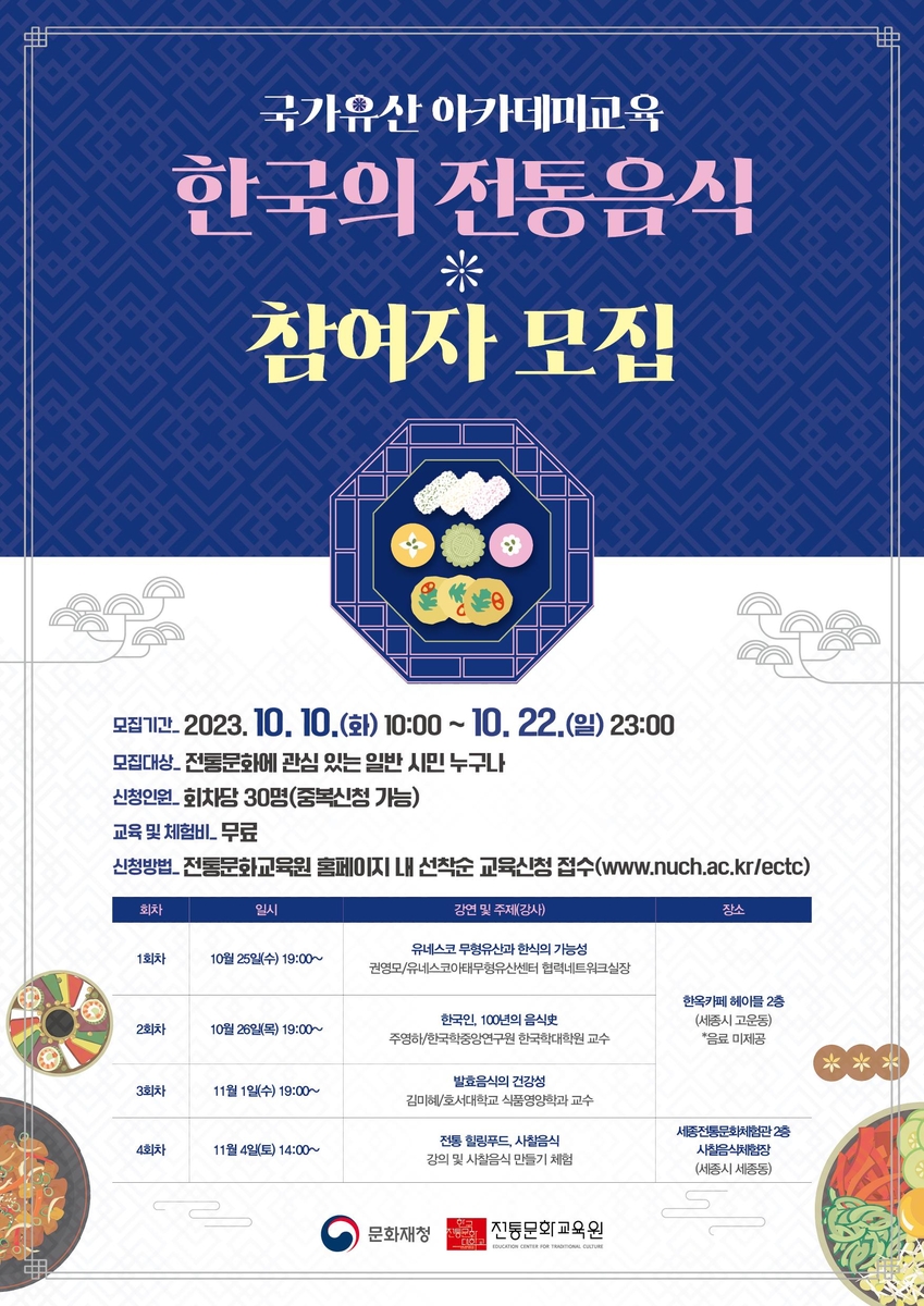 ▲ 강연과 체험으로 배우는 한국의 전통 음식 = 한국전통문화대 전통문화교육원은 이달 25일부터 총 4차례에 걸쳐 '국가유산 아카데미 교육'을 운영한다.
