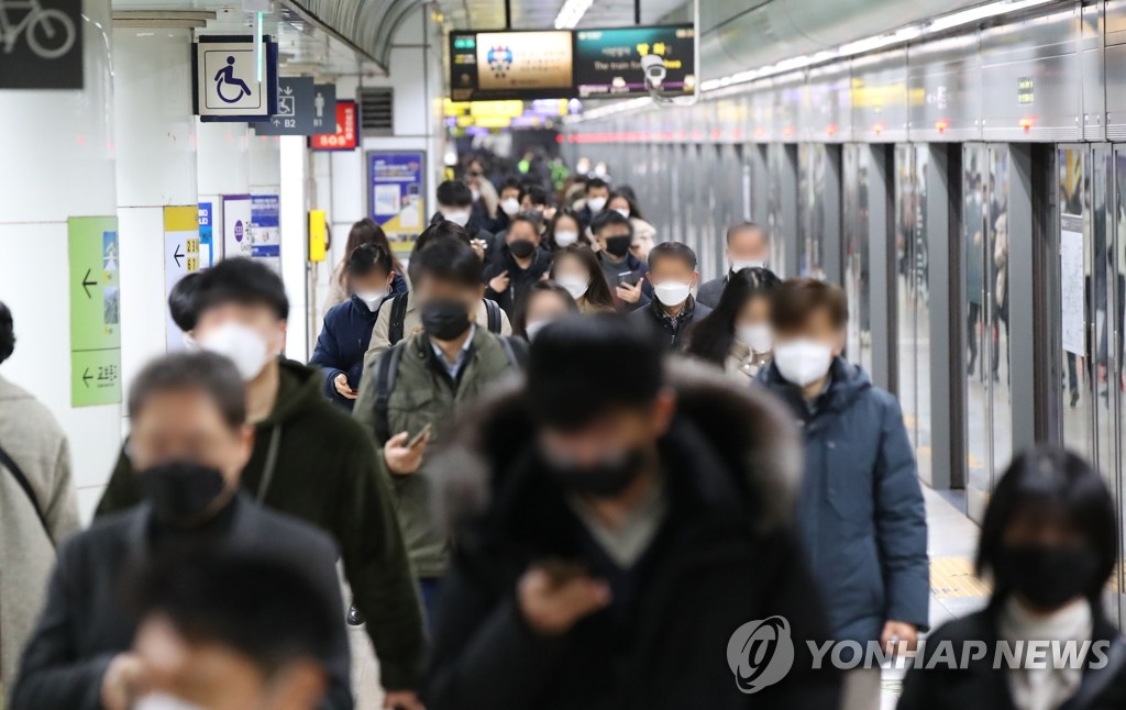 ▲ A platform is crowded with commuters during the morning rush hour at a subway station in Seoul on Dec. 20, 2021. (Yonhap)