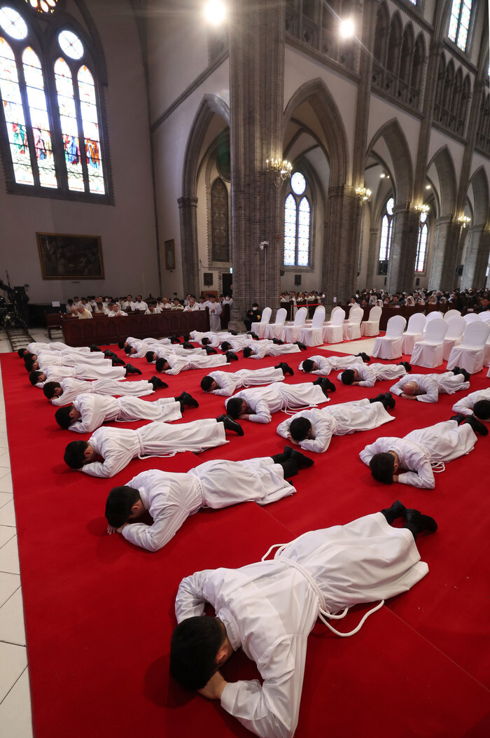 Catholic priest candidates prostrate themselves to pray during an ordination ceremony at Myeongdong Cathedral in Seoul on Feb. 1, 2024. (Pool photo) (Yonhap)