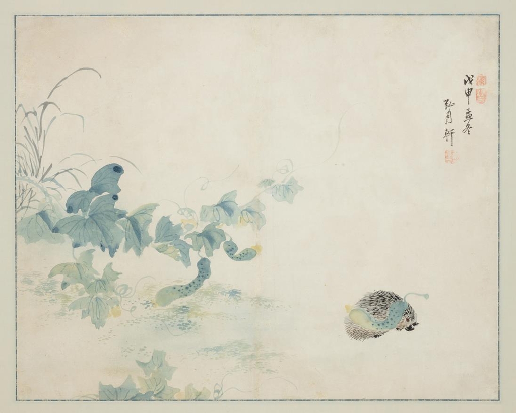 이번 전시에서 처음 공개하는 '자위부과도'(刺蝟負瓜圖)는 고슴도치가 오이를 이고 달아나는 모습을 그린 재미난 그림이다. 씨가 많은 오이, 가시가 많은 고슴도치 모두 다산의 상징이다.
