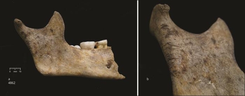 | ▲ 절단 흔적이 있는 10살 어린이의 오른쪽 아래턱뼈 표면에 절단 흔적이 남아 있는 10살 어린이의 오른쪽 아래턱뼈. [Schulting et al. Antiquity, December 2024 제공. 재판매 및 DB 금지] |