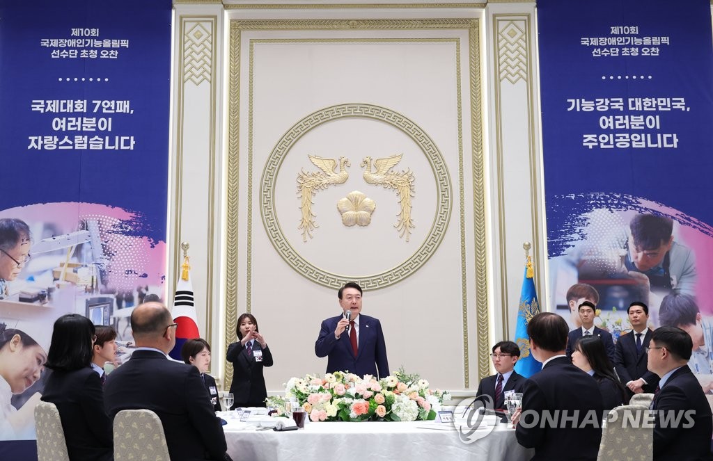 SEOUL, May 9 (Yonhap) -- President Yoon Suk Yeol met Tuesday with a group of skilled disabled people who topped the medal standings at a recent international event, saying he will provide better support to help them achieve their goals.
