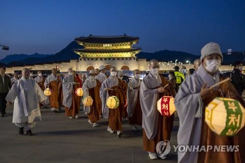 | ▲ In this file photo, Buddhist monks circle a large pagoda-shaped lantern during a lighting ceremony at Gwanghwamun Square in Seoul on April 26, 2023, in preparation for Buddha's Birthday, which falls on May 27 this year. (Yonhap) |