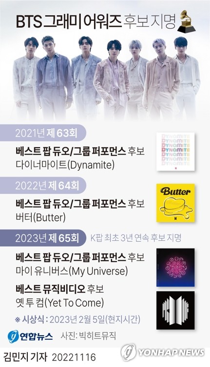 | ▲ [그래픽] BTS 그래미 어워즈 후보 지명 (서울=연합뉴스) 김민지 기자 = minfo@yna.co.kr 트위터 @yonhap_graphics 페이스북 tuney.kr/LeYN1 |