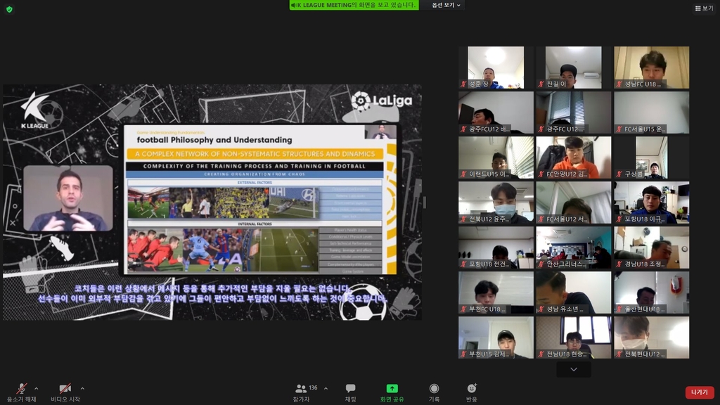 (서울=연합뉴스) 장보인 기자 = 한국프로축구연맹은 16일부터 이틀간 스페인 프로축구 프리메라리가(라리가)와 협업을 통한 'K리그 유소년 지도자 화상교육'을 개최했다고 17일 밝혔다.