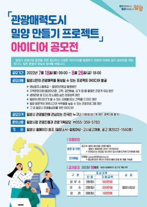 밀양시는 '영남 알프스' 둘레길∼밀양아리랑길 활용, 밀양아리랑·고택·공연예술 등 지역 문화자원을 활용한 관광객 유입, 생태관광 등 탄소중립 실천 관광 정책, 밀양시 상징물 디자인 제안, 방문객 체류시간·숙박률을 높이는 관광 프로그램 등을 중심으로 아이디어를 공개 모집한다.
