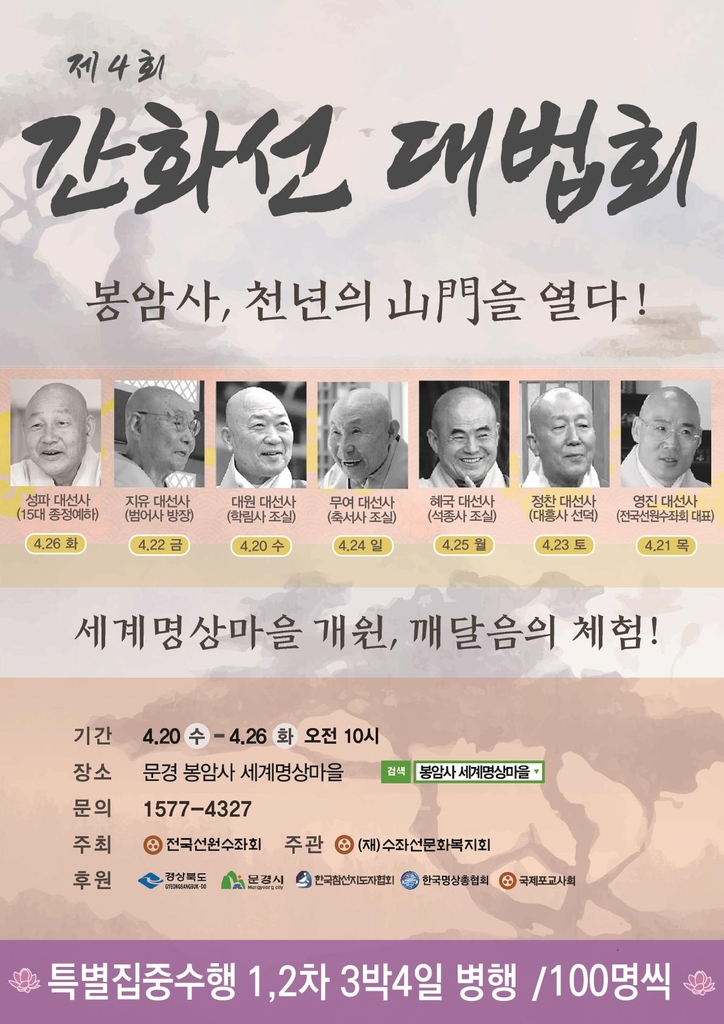 (서울=연합뉴스) 양정우 기자 = 전국 선승과 불자가 한자리에 모여 마음속 진리를 찾는 '간화선 대법회'가 내달 경북 문경의 봉암사 세계명상마을에서 열린다.