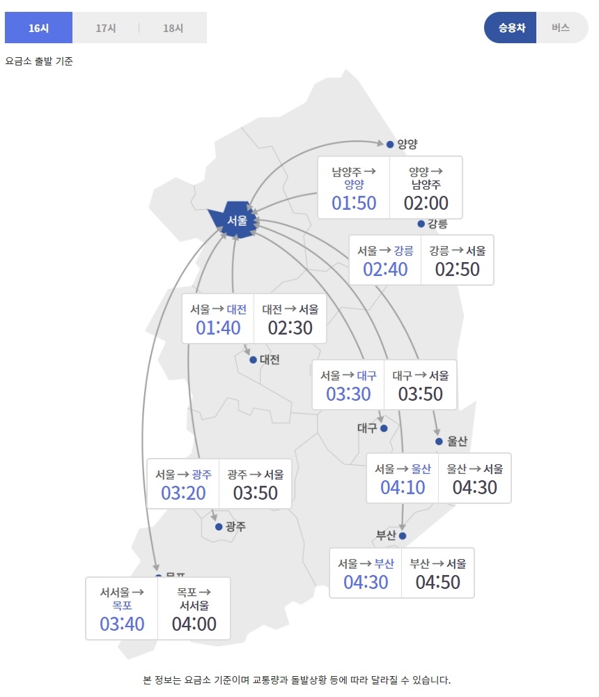 오후 4시 기준 승용차로 전국 주요 도시를 출발해 서울 요금소까지 걸리는 예상 시간은 부산 4시간 50분, 울산 4시간 30분, 대구 3시간 50분, 광주 3시간 50분, 강릉 2시간 50분, 대전 2시간 30분이다.