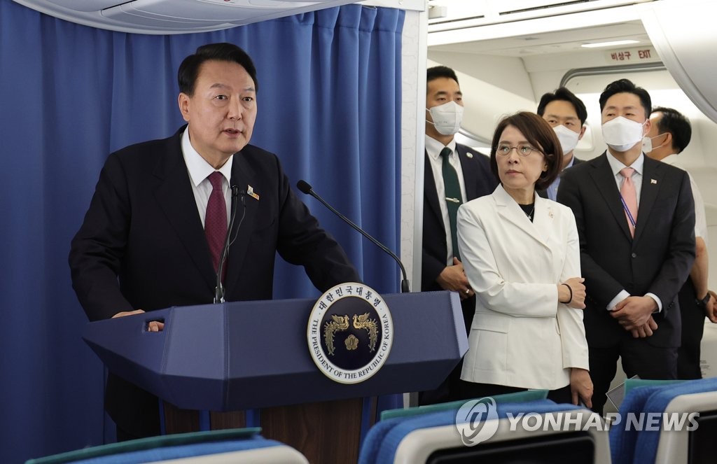 | ▲ President Yoon Suk-yeol speaks to reporters aboard Air Force One on July 1, 2022, en route home from Madrid, Spain, where he attended the North Atlantic Treaty Organization summit this week. (Yonhap) |