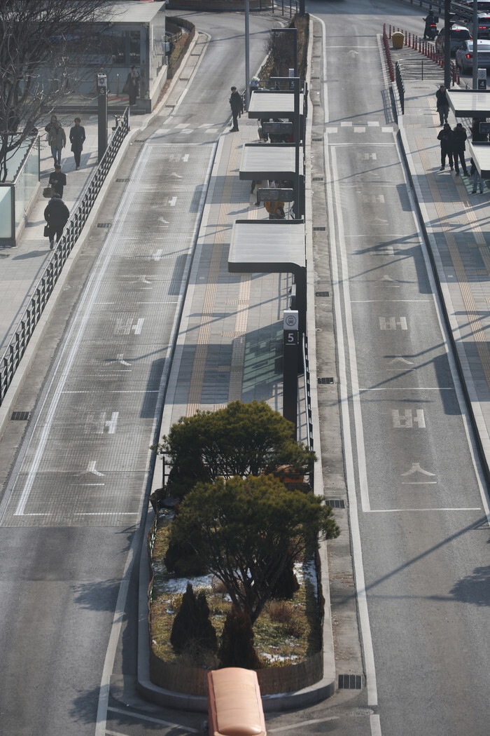 This photo, taken Jan. 14, 2026, shows a vacant bus stop in front of Seoul Station, as unionized intracity bus workers in the capital launched an indefinite strike for the second straight day following the breakdown of their wage hike negotiations with management. (Yonhap)