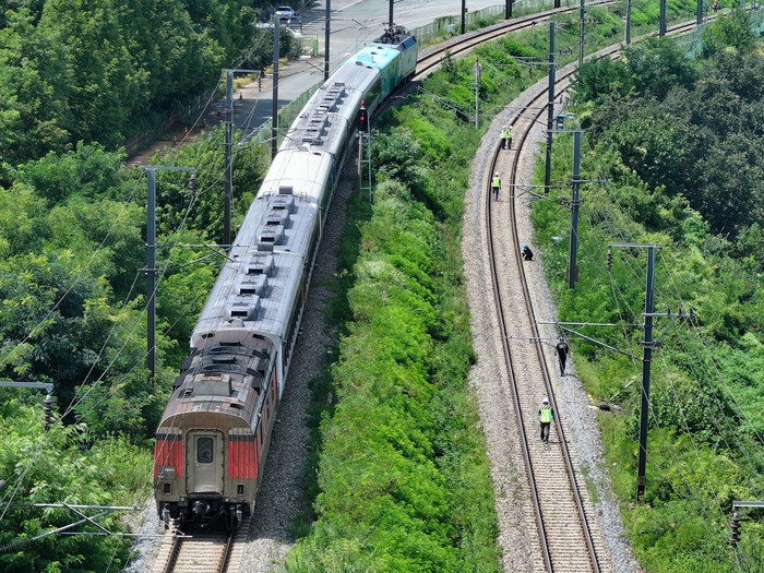 Officials from the Aviation and Railway Accident Investigation Board examine the site of a train accident on the tracks of the Seoul-Busan railway in Cheongdo, North Gyeongsang Province, southeastern South Korea, on Aug. 20, 2025, one day after a Mugunghwa train hit seven workers inspecting structures on a slope near the tracks. The accident left two workers dead and four others seriously hurt, with the remaining one worker sustaining light injuries. (Yonhap)