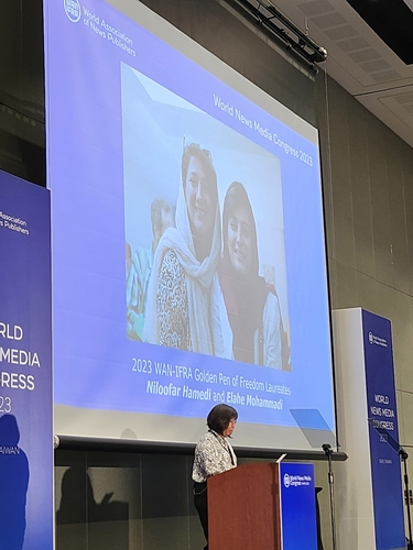 | ▲ 자유의 황금펜상 수상자 발표 (타이베이=연합뉴스) 28일 대만 타이베이에서 열린 제74회 세계뉴스미디어총회(World News Media Congress 2023) 행사에서 마사 라모스 세계 편집자 포럼 회장이 자유의 황금펜상 수상자를 발표하고 있다. 올해 수상자는 히잡 시위 의문사를 보도해 수감 중인 이란 여성 언론인 엘라헤 모하마디와 닐루파르 하메디 두 명이 공동 선정됐다. 2023.06.28 [촬영 손유민] |