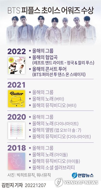 | ▲ [그래픽] BTS 피플스 초이스 어워즈 수상 (서울=연합뉴스) 김민지 기자 = minfo@yna.co.kr 트위터 @yonhap_graphics 페이스북 tuney.kr/LeYN1 |