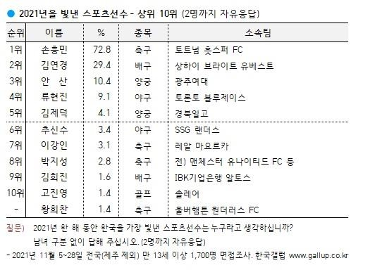 | ▲ 2021년을 빛낸 스포츠선수 상위 10위 [한국갤럽 제공. 재판매 및 DB 금지] |