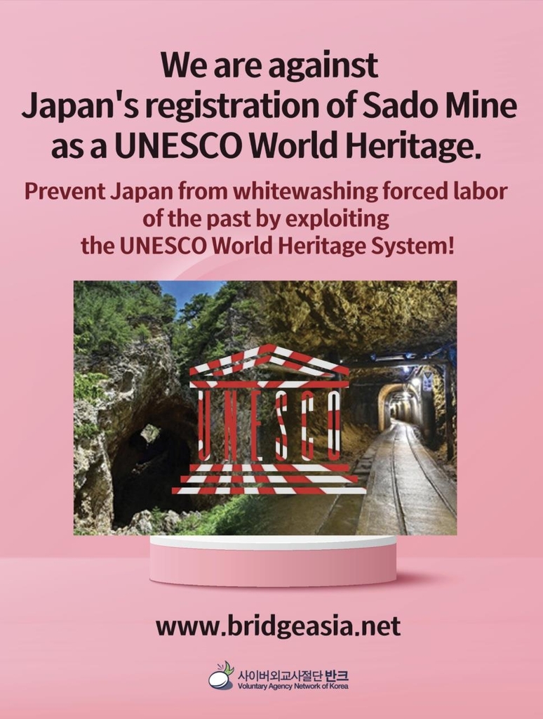 사이버 외교 사절단 반크가 7일 소셜미디어(SNS)에 배포하기 시작한 일본 정부의 사도(佐渡)광산 유네스코 세계유산 등재 추진을 반대하는 포스터의 제목이다.