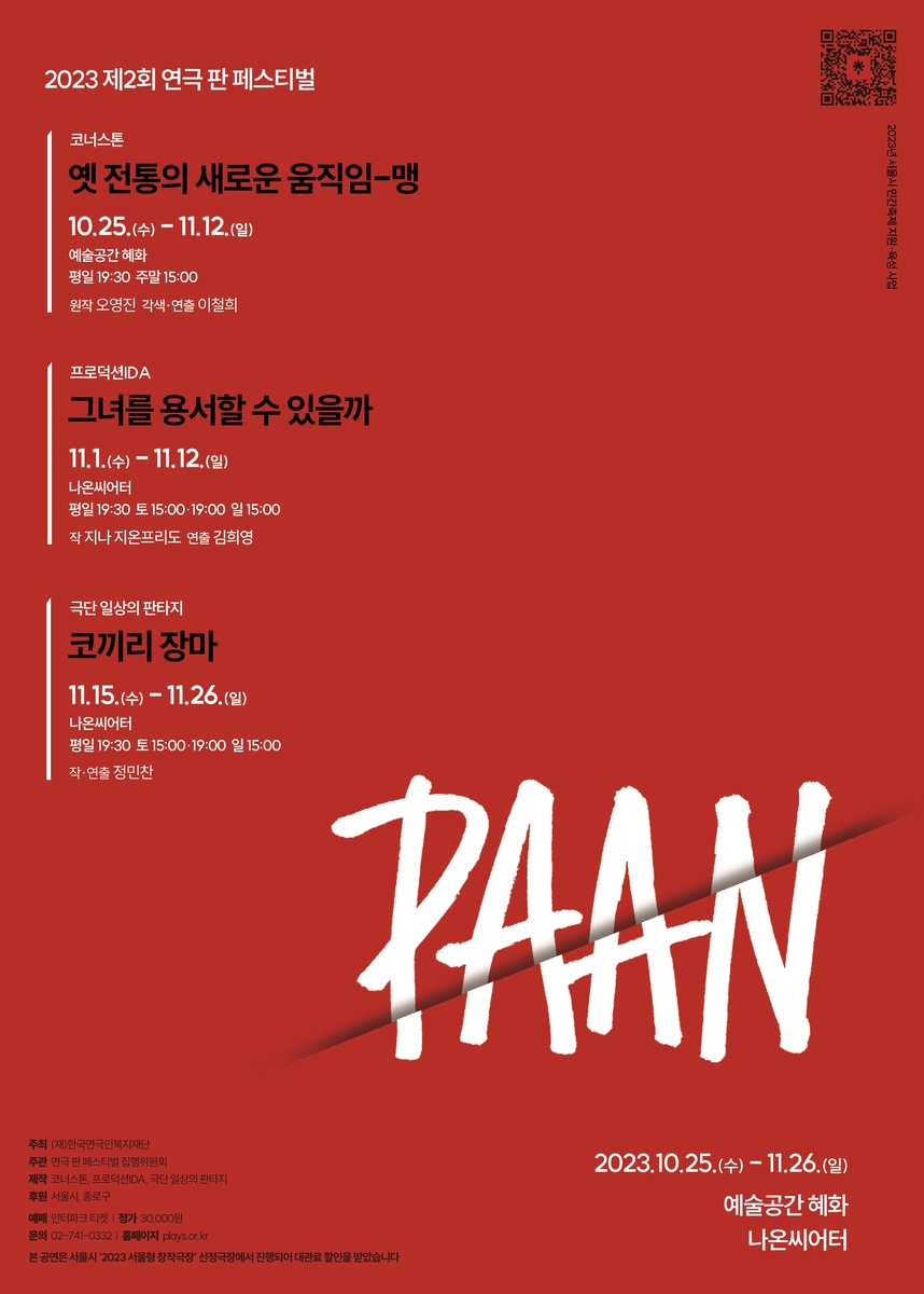 ▲ 소극장 우수 연극 재발견하는 페스티벌 = 재단법인 한국연극인복지재단은 오는 25일부터 11월 26일까지 서울 대학로 예술공간 혜화와 나온씨어터에서 '2023 제2회 연극 판 페스티벌'을 연다.