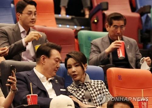 | ▲ This file photo provided by the presidential office shows President Yoon Suk Yeol and first lady Kim Keon Hee at a theater in Seoul on June 12, 2022, to watch a movie. (PHOTO NOT FOR SALE) (Yonhap) |