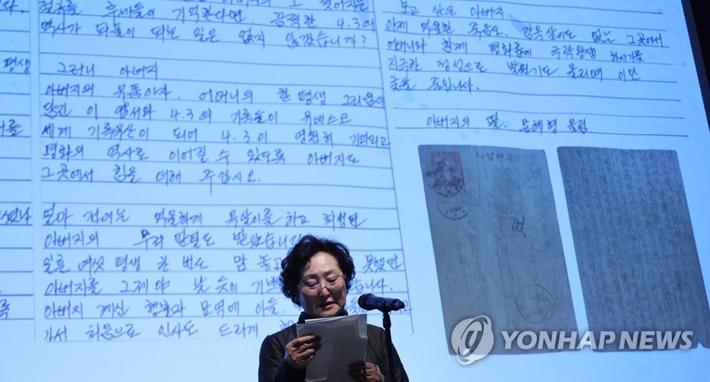| ▲ 제주4.3, 아버지의 엽서 (서울=연합뉴스) 한상균 기자 = 20일 한국프레스센터에서 열린 제주 4.3기록물 유네스코 세계기록유산 등재추진위 출범식에서 고 문순현 씨의 딸 문혜형 씨가 아버지께 보내는 편지를 읽고 있다. 고 문순현 씨의 엽서도 4.3기록물이다. 2023.2.20 xyz@yna.co.kr |