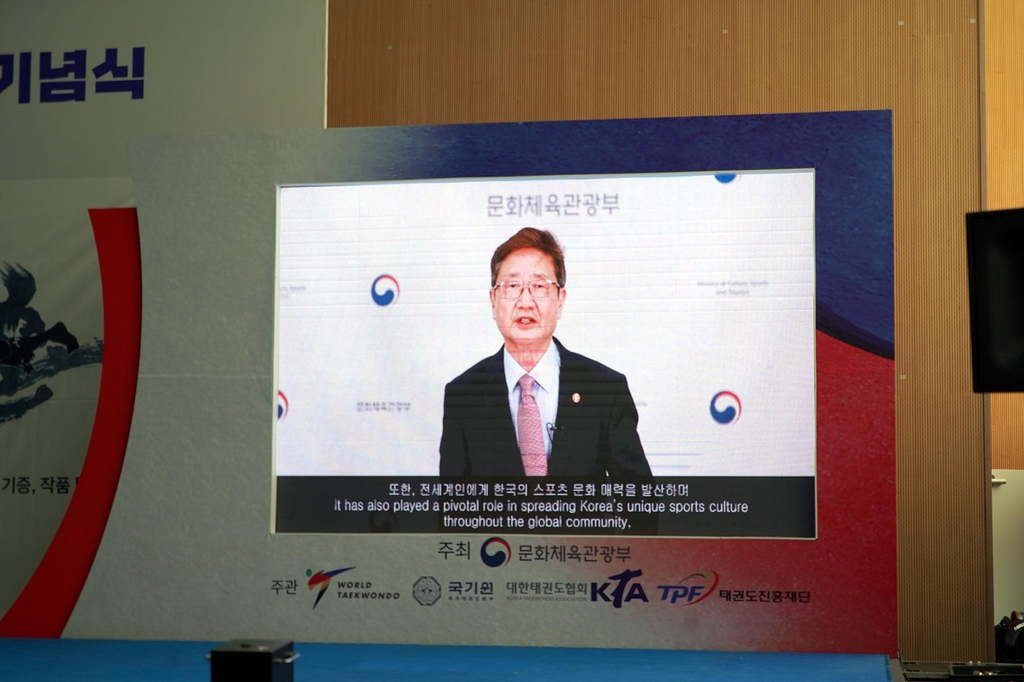 | ▲ 영상으로 기념사를 전하는 박보균 문체부 장관. [세계태권도연맹 제공. 재판매 및 DB 금지] |