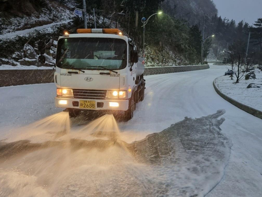 | ▲ 바닷물 뿌려 눈 녹이는 살수차 [울릉군 제공. 재판매 및 DB 금지] |