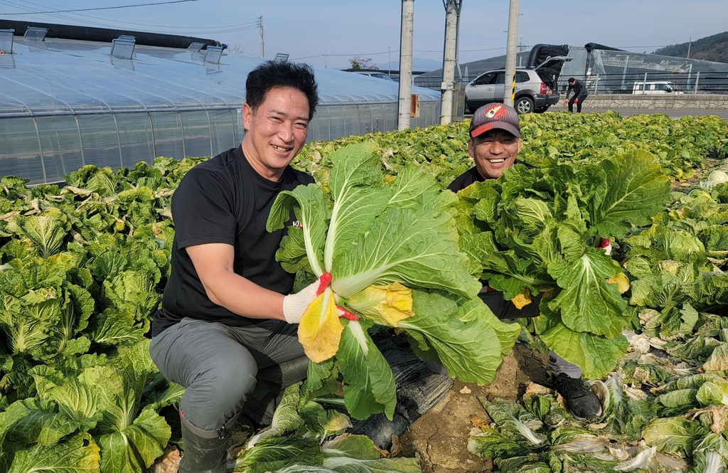 | ▲ 낚시하는 시민연합 소속 어깨동무 봉사대 회원들이 김장에 쓰일 배추를 수확하고 있다. [낚시하는 시민연합 제공] |