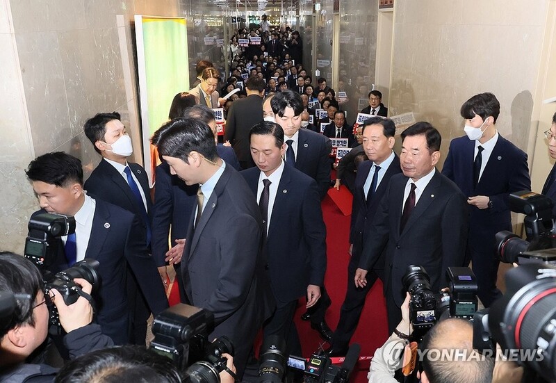 SEOUL, Nov. 30 (Yonhap) -- Lawmakers of the ruling People Power Party (PPP) launched a sit-in in front of the parliamentary chamber Thursday in protest of the main opposition Democratic Party's plan to impeach the chief of the state broadcasting watchdog.