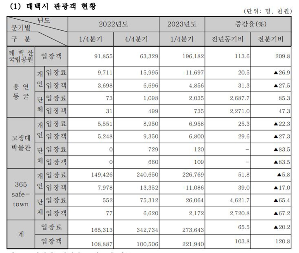 16일 태백상공회의소가 발표한 2023년 1분기 태백지역 경제 동향을 보면 2023년 1분기 태백산국립공원, 365 세이프타운, 고생대자연사박물관, 용연동굴 등 주요 관광지 입장객은 22만1천940명이다.