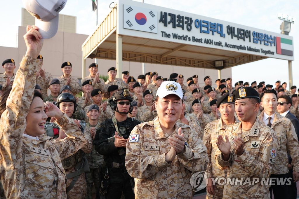 | ▲ President Yoon Suk Yeol (C) claps as he meets troops of the Akh unit, a South Korean military contingent in the United Arab Emirates, with first lady Kim Keon Hee (L), on Jan. 15, 2023. (Yonhap) |