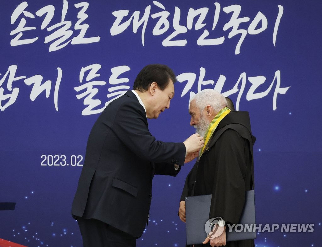SEOUL, Feb. 16 (Yonhap) -- President Yoon Suk Yeol conferred state awards on 19 meritorious people Thursday, including a Spanish priest known for his dedication to helping lepers.