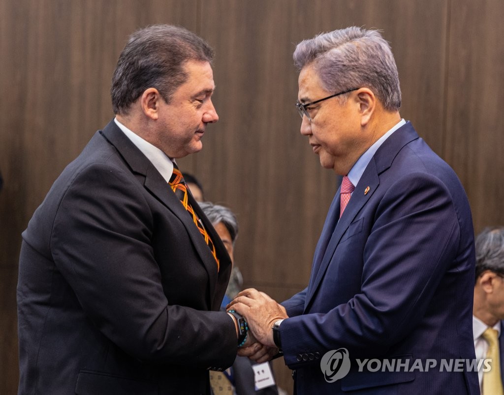 | ▲ South Korean Foreign Minister Park Jin (R) shakes hands with Turkish Ambassador to South Korea Murat Tamer at the foreign ministry in Seoul on Feb. 23, 2023, during a meeting with members of South Korea's Disaster Relief Team to Turkey. Park expressed his appreciation to the team, which recently returned from Turkey after aiding post-quake efforts. (Yonhap) |