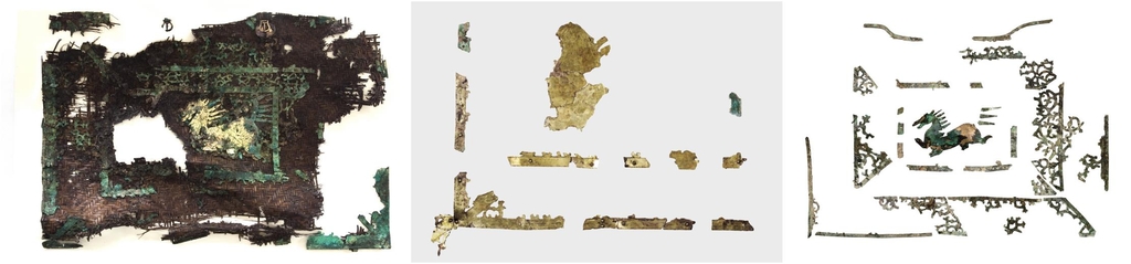 | ▲ 천마 무늬 말다래 유물 왼쪽부터 천마총, 금관총, 금령총에서 각각 출토된 유물 [국립경주박물관 제공. 재판매 및 DB 금지] |