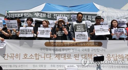| ▲ Protesters hold up a sign calling for measures for victims of a series of home rental scams under the country's "jeonse" housing rental system during a protest rally in front of the National Assembly building in Seoul on May 23, 2023. (Yonhap) |