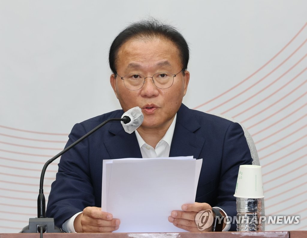 | ▲ The ruling People Power Party's floor leader, Rep. Yoon Jae-ok, speaks during a party meeting at the National Assembly in Seoul on July 7, 2023. (Yonhap) |