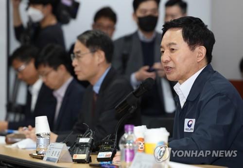 | ▲ Transport Minister Won Hee-ryong (R) speaks during a government meeting convened at Gimpo International Airport in western Seoul on April 14, 2023, to discuss measures to alleviate overcrowding on the Gimpo Goldline. (Yonhap) |