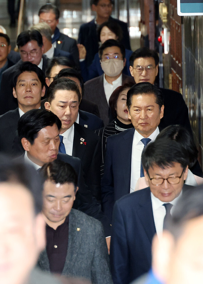 Democratic Party lawmakers leave a conference room of the National Assembly in Seoul on Dec. 8, 2025, after a meeting over its judicial reform plans. (Yonhap)