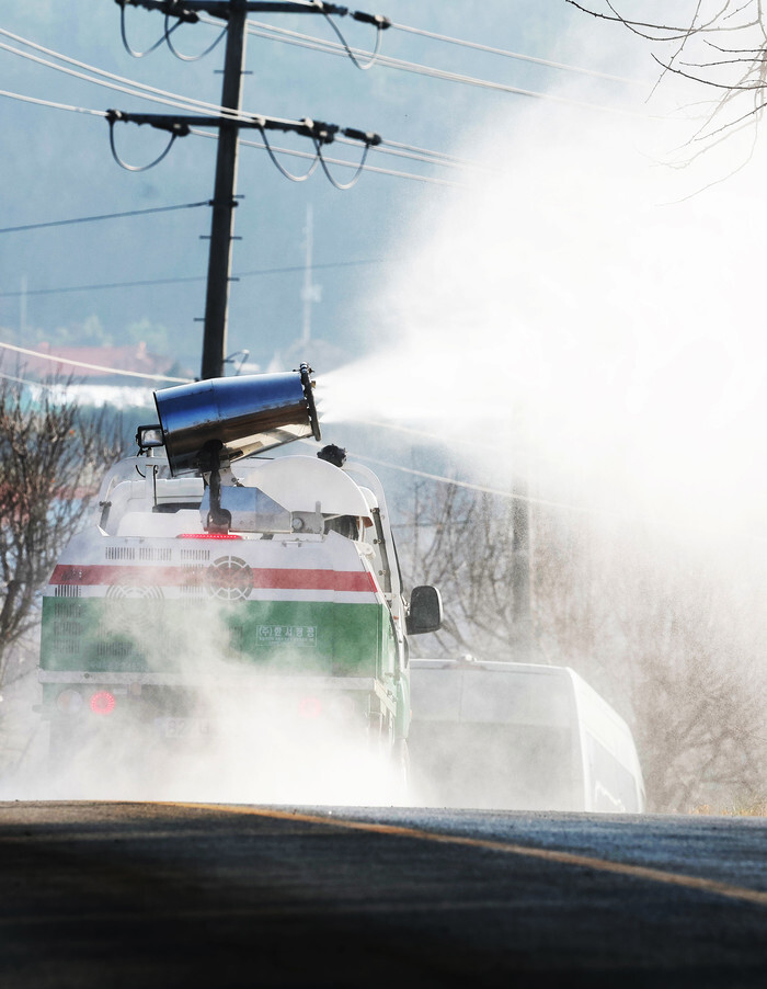 A quarantine vehicle disinfects a village in Anseong, south of Seoul, on Dec. 17, 2025, after a highly pathogenic strain of H5N1 avian influenza was detected at an egg farm near the area the previous day. (Yonhap)