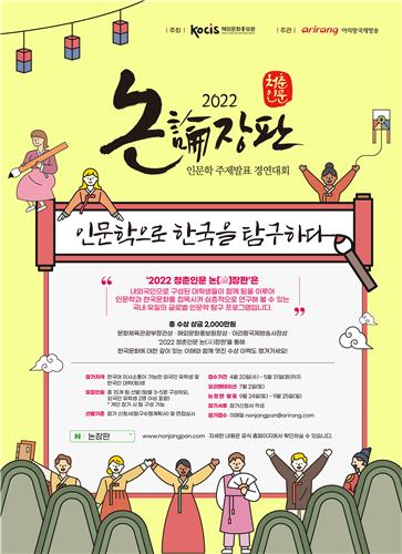 ▲ '청춘인문 논(論)장판' 참가자 모집 = 문화체육관광부 해외문화홍보원이 주최하고 아리랑TV가 주관하는 인문학 탐구 경연대회 '청춘인문 논(論)장판'이 31일까지 참가자를 모집한다.