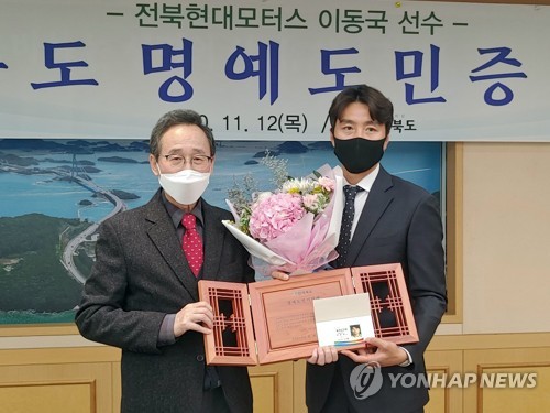 이동국은 명예도민증을 받고 "축구선수 타이틀을 내려놓지만, 오랫동안 전라북도를 지켜오며 더없이 큰 도민 사랑을 받고 제2의 전성기를 누렸다"며 "전북은 영원한 마음속 고향"이라고 밝혔다.