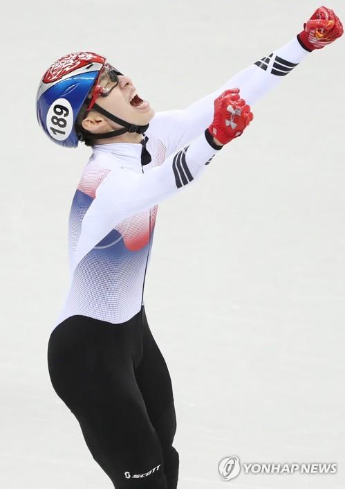| ▲ In this file photo from Feb. 10, 2018, Lim Hyo-jun of South Korea celebrates after winning gold in the men's 1,500m short track speed skating race at the PyeongChang Winter Olympics at Gangneung Ice Arena in Gangneung, 230 kilometers east of Seoul. (Yonhap) |