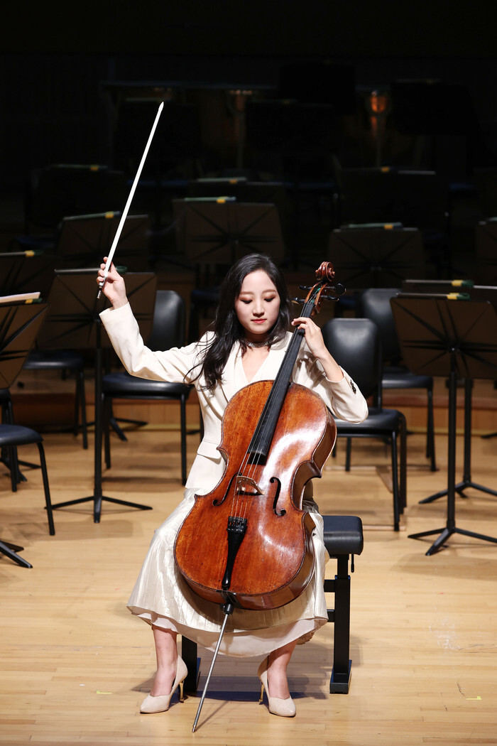 South Korean cellist Choi Ha-young, selected as the 2025 Lotte Concert Hall's "In House Artist," performs during a press conference in Seoul on Nov. 21, 2024. (Yonhap)