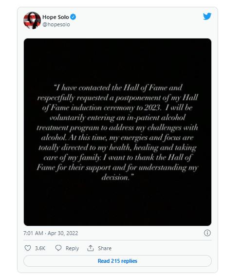 올해 미국 축구 명예의 전당에 헌액될 예정이었던 솔로는 "명예의 전당 측에 연락해 헌액식을 2023년으로 연기해 달라고 정중히 요청했다"라고도 알렸다.