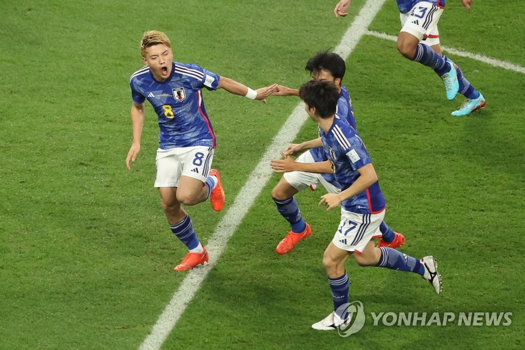 | ▲ 도안 동점골 환호 (알라이얀=연합뉴스) 김주성 기자 = 1일 오후(현지시간) 카타르 알라이얀의 칼리파 인터내셔널 스타디움에서 열린 2022 카타르 월드컵 조별리그 E조 3차전 일본 대 스페인 경기. 동점골을 넣은 일본의 도안 리쓰와 선수들이 환호하고 있다. 2022.12.2 utzza@yna.co.kr |