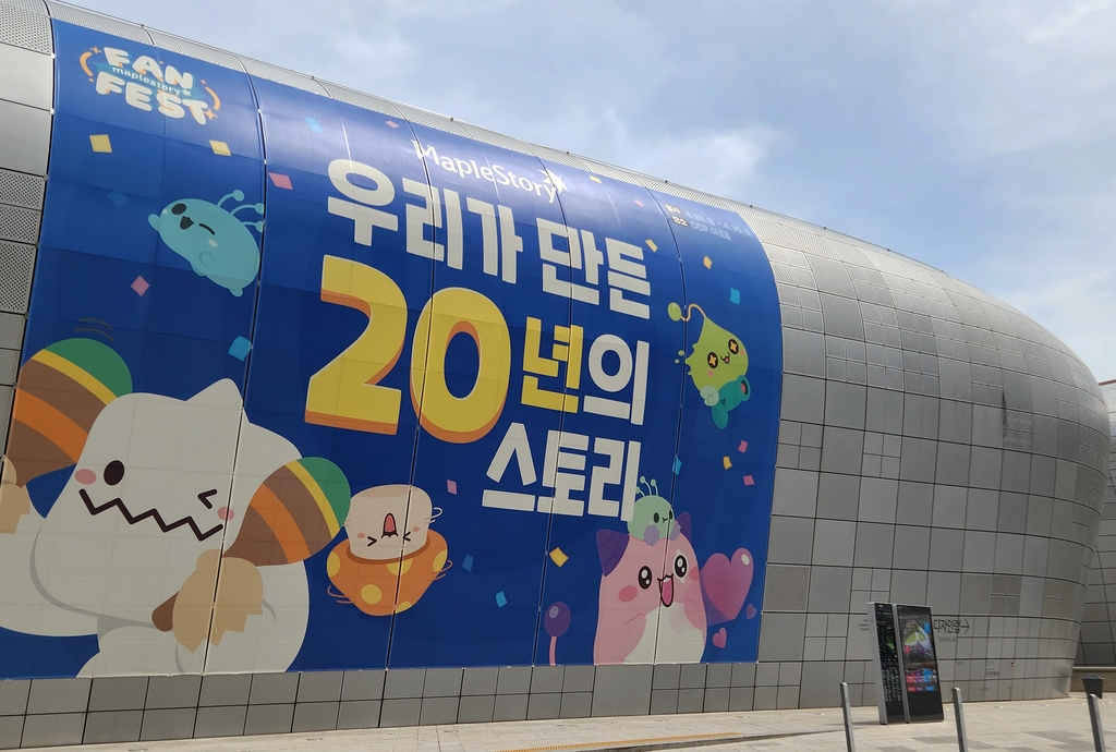 | ▲ "우리가 만든 20년의 스토리" (서울=연합뉴스) 김주환 기자 = 28일 넥슨코리아가 주최한 메이플스토리 서비스 20주년 기념 '팬 페스트' 행사가 열리는 서울 중구 동대문디자인플라자(DDP) 외벽에 대형 벽보가 붙어 있다. 2023.4.28. jujuk@yna.co.kr |
