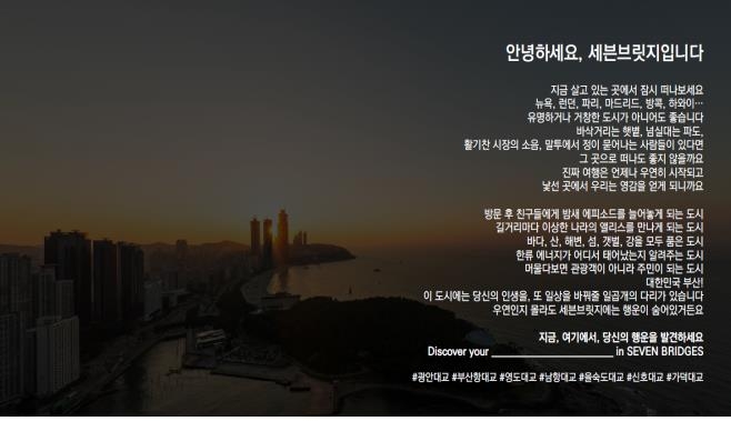 지난해 9월 착수한 세븐브릿지 프로젝트는 부산 7개 해양 교량을 단순한 이동 수단이 아닌 관광자원으로 활용하자는 취지에서 기획됐으며 다리로 연결된 부산에서 자신만의 행운을 찾아볼 것을 제안한다.