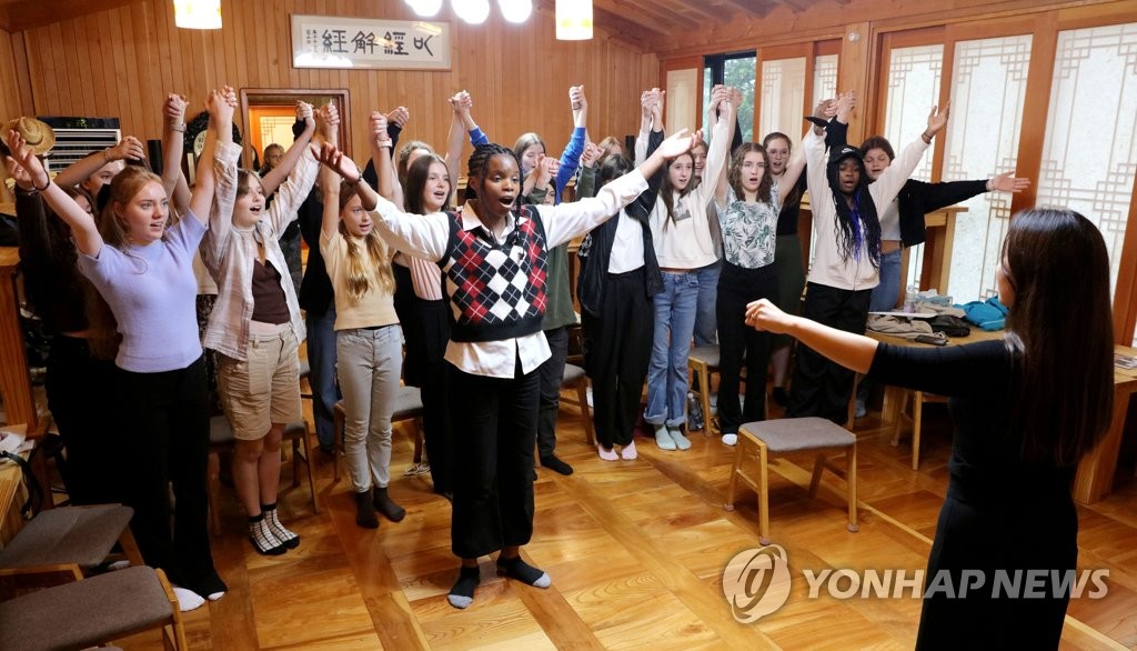| ▲ 제주 찾은 독일 도르트문트청소년합창단 (제주=연합뉴스) 김호천 기자 =독일 NRW주 도르트문트청소년합창단원 정나래 지휘자가 단원들과 함께 지난 4일 제주에서 연습하는 모습. 이 합창단은 5일 오후 제주도문예회관에서 열리는 제61회 탐라화제 사전 음악제에서 공연한다. 2022.10.5 khc@yna.co.kr |