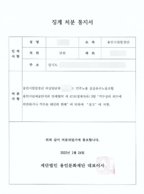 16일 민주노총 공공운수노조 경기문화예술지부 용인시립예술단지회와 용인문화재단에 따르면 재단은 지난달 24일 합창단원 51명 가운데 46명(90%)을 '직무상 의무 위반·직무 태만' 등 사유로 경징계(경고) 처분했다.
