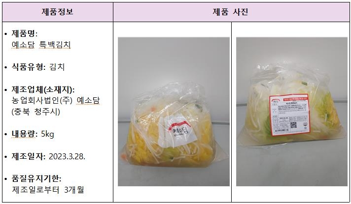 회수 대상 제품은 농업회사법인 예소담(충북 청주시 소재)이 제조·판매한 '예소담 특백김치' 중 제조연원일이 2023년 3월 28일인 제품으로, 식중독균인 '여시니아 엔테로콜리티카'가 기준 부적합으로 확인됐다.