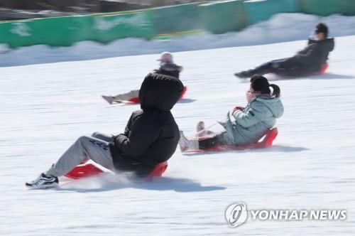 경기 가평 썰매장에서도 엄마·아빠와 함께 온 아이들이 눈썰매를 타고 빠르게 내려오며 스릴을 즐겼다.